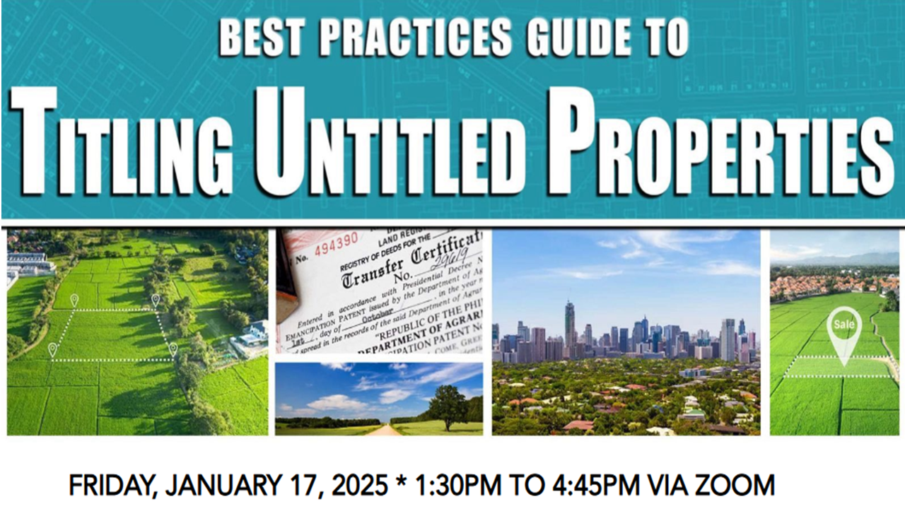 Transform your untitled land into an asset. Register now and equip yourself with the comprehensive knowledge to navigate the intricacies of land titling. Join us in this three-hour lecture that will walk you through the essentials of titling untitled lands in the Philippines.