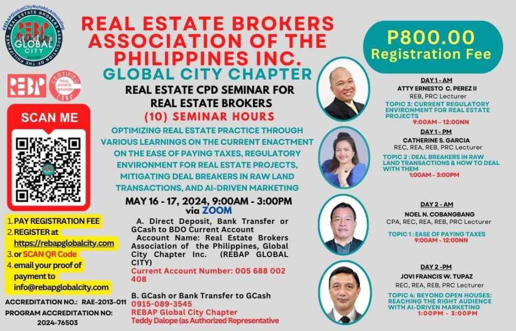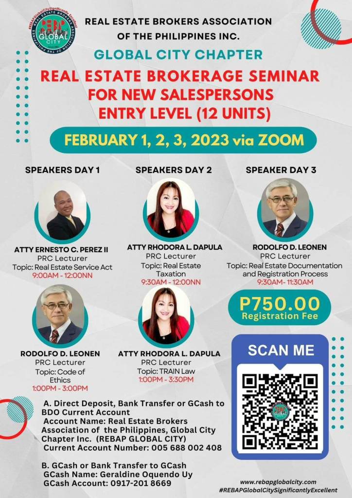 This is the Entry-level Seminar for aspiring Real Estate Salespersons who desire to be accredited under Rep. Act No. 9646, brought to you by REBAP Global City Chapter. I will present on November 19, 2023, the topic Documentation & Registration of Real Estate Transactions. Kindly register at the Website of the Chapter or scan the QR Code. Then please upload your proof of payment to info@rebapglobalcity.com. See you on the day of the Webinar.