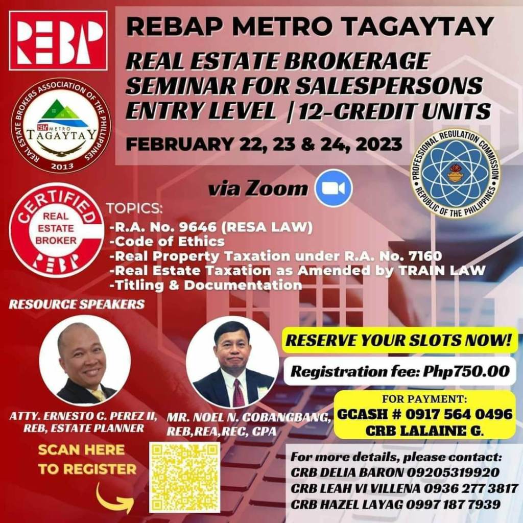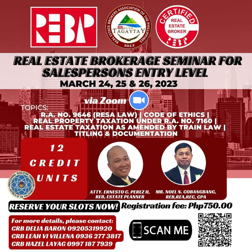 This is the Entry-level Seminar for aspiring Real Estate Salespersons who desire to be accredited under Rep. Act No. 9646, brought to you by REBAP Metro Tagaytay Chapter. I will present the following topics on March 24 & 26, 2023, respectively: (1) Standards of Practice Under RA 9646 [RESA]; (2) Code of Ethics and Responsibilities of RESPs; and (3) Documentation & Registration of Real Estate Transactions. Scan the QR Code or contact the CRBs at their contact numbers. Payment of the investment fee is thru GCash – 09175640496, Ms. Lalaine Gali.