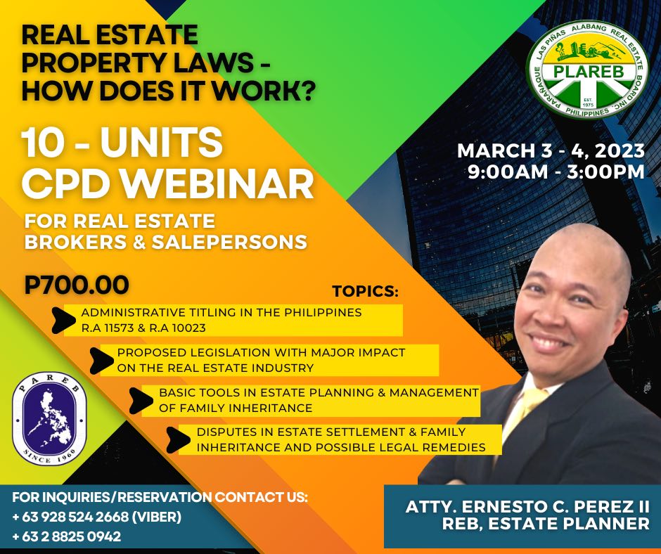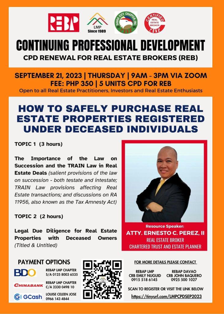 There are numerous real estate brokers and accredited salespersons who need to renew their licenses and accreditation this 2023. You may be one of them. This CPD Event is brought to you by the combined powers of two (2) REBAP Chapters — Las Piñas-Muntinlupa-Parañaque Chapter and Davao City Chapter. For this one-day Webinar, I will be presenting the following topics: (1) The Importance of the Law on Succession and the TRAIN Law in Real Estate Transactions; and (2) Legal Due Diligence for Real Estate Properties with Deceased Owners. This Webinar will aid RESPs expand their knowledge base and enhance his/her competency, proficiency, and expertise in the practice. You can enroll by contacting the numbers on the banner for more information on the registration procedures.