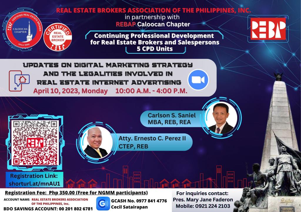 In connection with the first National General Membership Meeting (NGMM) of the Real Estate Brokers Association of the Philippines, Inc. (REBAP), in partnership with REBAP Caloocan Chapter this 2023, there will be a 5-Unit CPD event for the benefit of those numerous real estate brokers and accredited salespersons who need to renew their licenses and accreditation this 2023. The topic that I will discuss is “The Regulations of Selling Real Estate in the Philippines Through the Internet.” If you post your listings using social media applications, you should definitely attend and know what the RESA and DHSUD regulations are that affect your posts online.