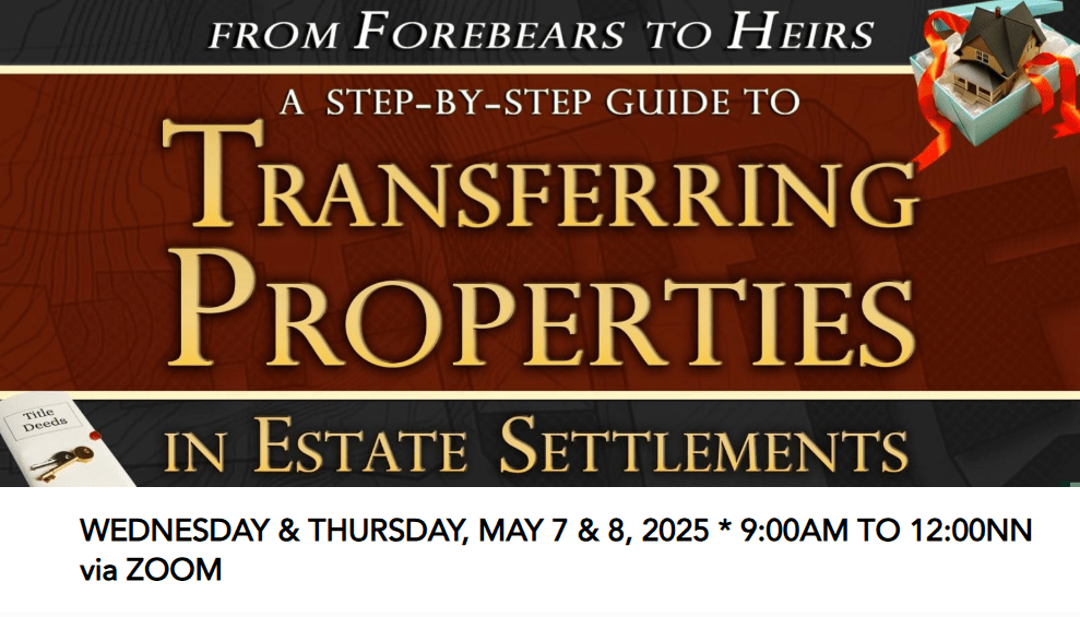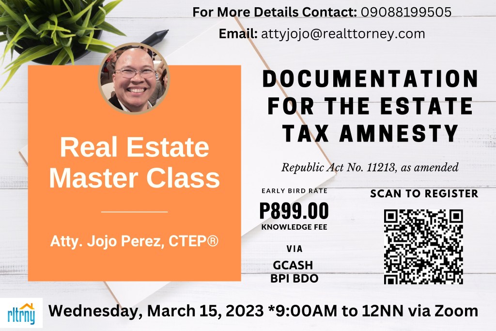 In this two-session online lecture, we will provide attendees a comprehensive step-by-step guide on legally transferring those properties to all heirs and availing of the benefits of the estate tax amnesty law. You will gain clarity on the estate settlement processes, estate taxation, and essential documentary requirements. It takes time to obtain and prepare all documents. Do not delay. Save on taxes! Save on time! Take the first step in securing your inheritance. Enroll and join this training.