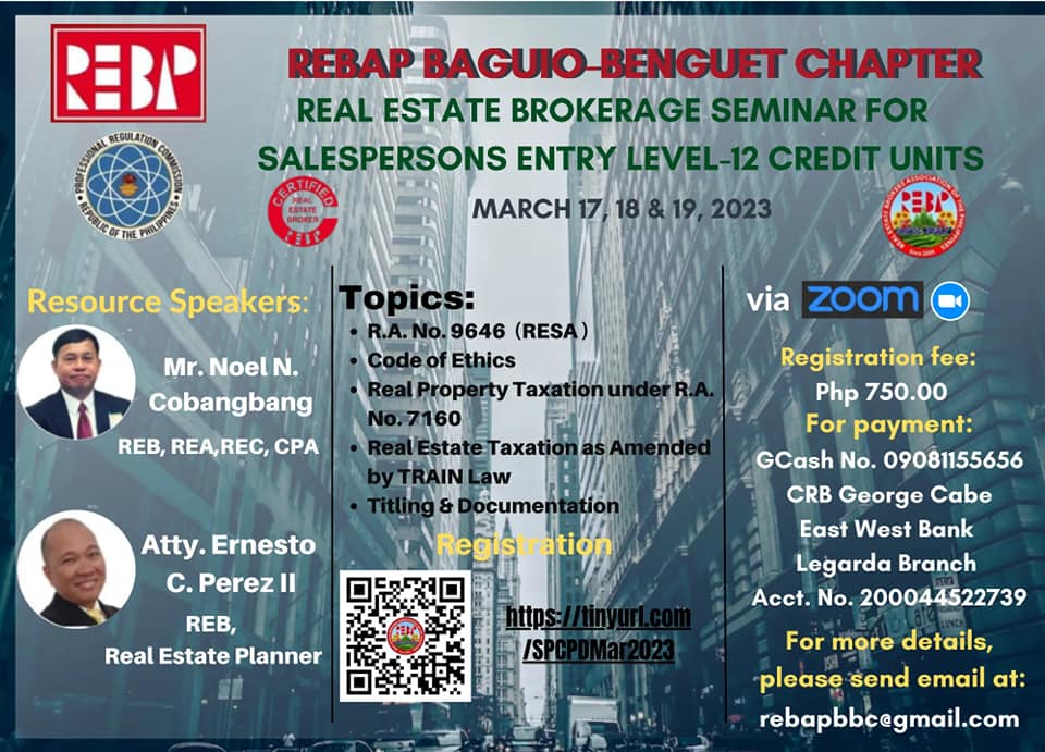 This is the Entry-level Seminar for aspiring Real Estate Salespersons who desire to be accredited under Rep. Act No. 9646, brought to you by REBAP Bauio-Benguet Chapter. I will present the following topics on March 17 & 18, 2023, respectively: (1) Standards of Practice Under RA 9646 [RESA]; (2) Code of Ethics and Responsibilities of RESPs; and (3) Documentation & Registration of Real Estate Transactions. Scan the QR Code or send them an email at rebapbbc@gmail.com.