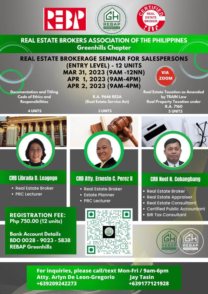 This is the Entry-level Seminar for aspiring Real Estate Salespersons who desire to be accredited under Rep. Act No. 9646, brought to you by REBAP Greenhills Chapter. I would be presenting the topic “Standards of Practice for Real Estate Service Practitioners under RESA” on April 1, 2023. Scan the QR Code or contact Atty. Arlyn De Leon-Gregorio to join.