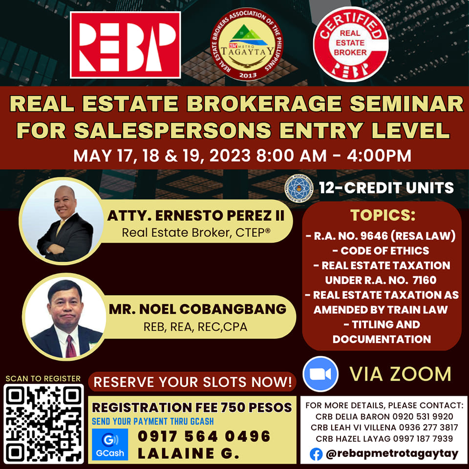 This is the Entry-level Seminar for aspiring Real Estate Salespersons who desire to be accredited under Rep. Act No. 9646, brought to you by REBAP Metro Tagaytay Chapter. I will present the following topics on May 17 & 19, 2023, respectively: (1) Standards of Practice Under RA 9646 [RESA]; (2) Code of Ethics and Responsibilities of RESPs; and (3) Documentation & Registration of Real Estate Transactions. Scan the QR Code or contact the CRBs at their contact numbers on the banner. Payment of the investment fee is thru GCash – 09175640496, Lalaine G. Thereafter, you can go and register using this link (https://forms.gle/bGCXUth87AHMHfPu7) and upload your proof of payment.