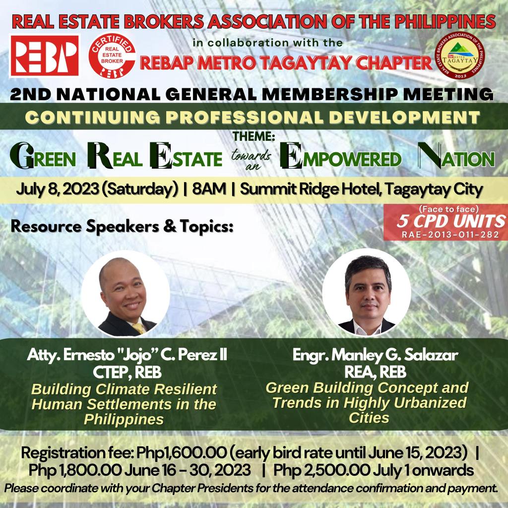 In connection with the second National General Membership Meeting (NGMM) of the Real Estate Brokers Association of the Philippines, Inc. (REBAP), in partnership with REBAP Metro Tagaytay Chapter, there will be a 5-Unit CPD event for the benefit of those numerous real estate brokers and accredited salespersons who need to renew their licenses and accreditation this 2023. The topic that I will discuss is “Building Climate Resilient Human Settlements in the Philippines.” For 3 hours, we will discuss what are climate-resilient human settlements and why there is a dire need to build such settlements in the face of a warming planet, and what are the plans of the Philippines to face this enormous challenge.