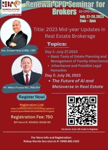 There are numerous real estate brokers and accredited salespersons who need to renew their licenses and accreditation this 2023. You may be one of them. This CPD Event is brought to you by REBAP Mandaluyong Chapter. I will be presenting the following topics on July 27, 2023: (1) Basic Tools of Estate Planning and Management of Family Inheritance; and (2) Disputes in Estates and Family Inheritance & Possible Legal Remedies. This two-day Webinar will definitely help RESPs in expanding their knowledge base and enhance his/her competency, proficiency, and expertise in the practice. You can enroll by contacting the numbers on the banner for more information on the registration procedures.