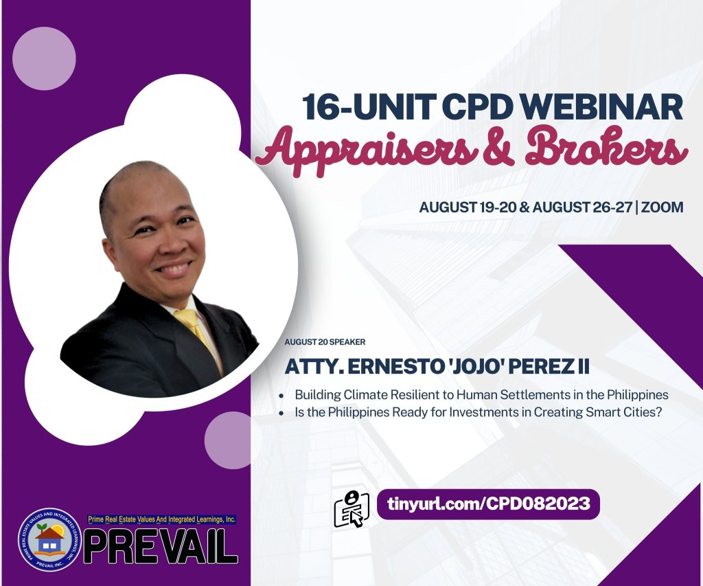 There are numerous real estate brokers and accredited salespersons who need to renew their licenses and accreditation this 2023. You may be one of them. This CPD Event is brought to you by Prime Real Estate Values and Integrated Learnings, Inc. (PREVAIL). I will present the following topics: (1) Building Climate Resilient Human Settlements in the Philippines and (2) Is the Philippines Ready for Investments in Creating Smart Cities. Copy the TinyURL link on your phone or browser and follow the link to register.