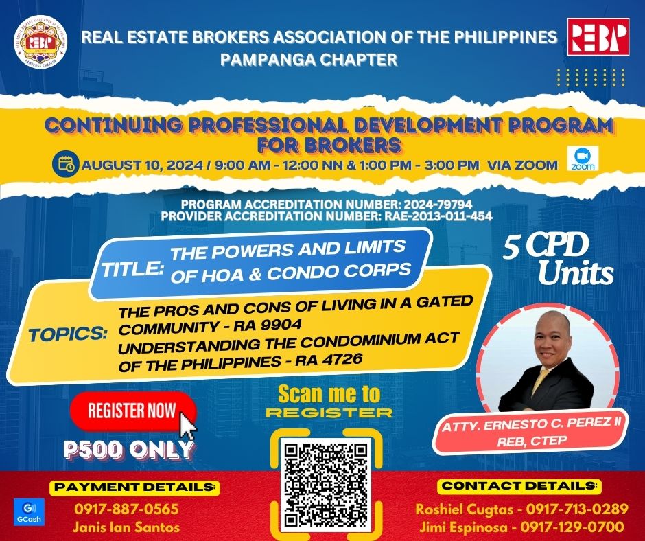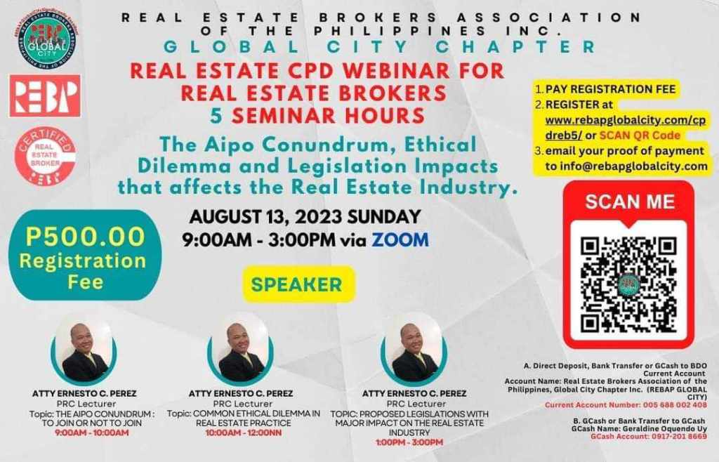 I will cap off the 3-day CPD Webinar of REBAP Global City Chapter. For our fellow real estate brokers who need to renew their licenses and accreditation for the remaining five months of 2023, you should attend this. I will be presenting the following topics on August 13, 2023: (1) The AIPO Conundrum: To Join or Not To Join; (2) Common Ethical Dilemma in Real Estate Brokerage Practice; and (3) Proposed Legislations with Major Impact on the Real Estate Industry. This 3-day CPD Webinar will definitely help RESPs expand their knowledge base and enhance his/her competency, proficiency, and expertise in the practice. You can enroll by scanning the QR Code on the banner.