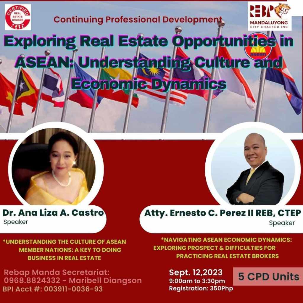 This CPD Webinar is brought to you by REBAP Mandaluyong Chapter in connection with the 3rd National General Membership Meeting of the Real Estate Brokers Association of the Philippines, Inc. This CPD Event centers on understanding and embracing the membership of the Philippines in the Association of South East Asian Nations (ASEAN) and all this membership entails for Real Estate Service Practitioners. I will be presenting the following topic: Navigating ASEAN Economic Dynamics: Exploring Prospects & Difficulties for Practicing Real Estate Service Practitioners. You can attend this Zoom event by contacting the numbers on the banner for more information on the registration procedures.