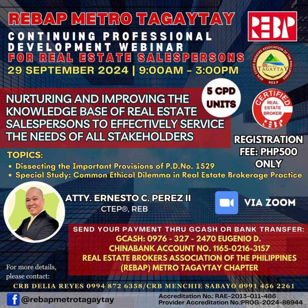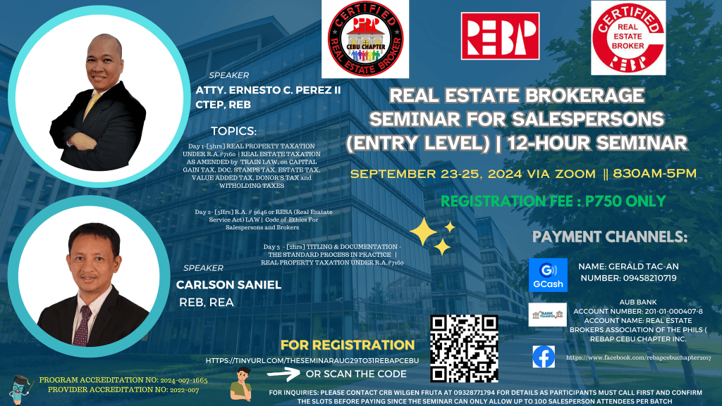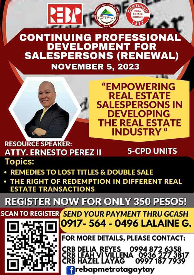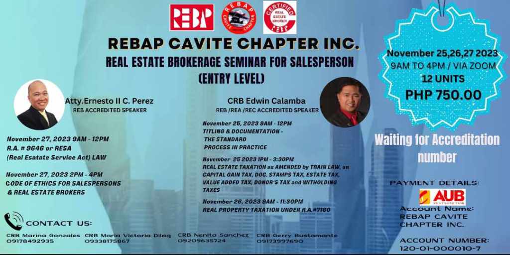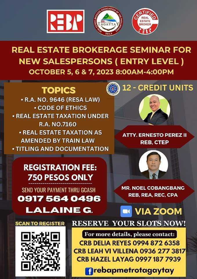 This is the Entry-level Seminar for aspiring Real Estate Salespersons who desire to be accredited under Rep. Act No. 9646, brought to you by REBAP Metro Tagaytay Chapter. I will present the following topics on October 5 & 7, 2023, respectively: (1) Standards of Practice Under RA 9646 [RESA]; (2) Code of Ethics and Responsibilities of RESPs; and (3) Documentation & Registration of Real Estate Transactions. To register for this Webinar, kindly contact the Chapter Officers at their respective contact details, or via the Facebook page of REBAP Metro Tagaytay. Payment of the investment fee is via GCash – 09175640496, Lalaine G. Then scan the QR Code to register and upload your proof of payment. See you on the day of the Webinar.