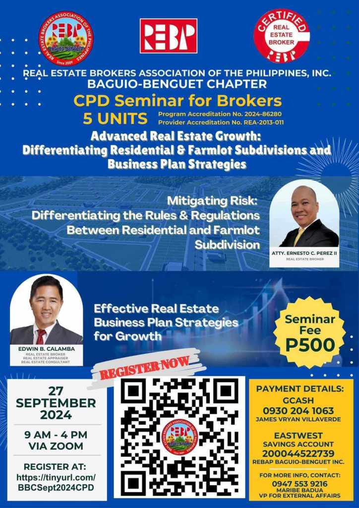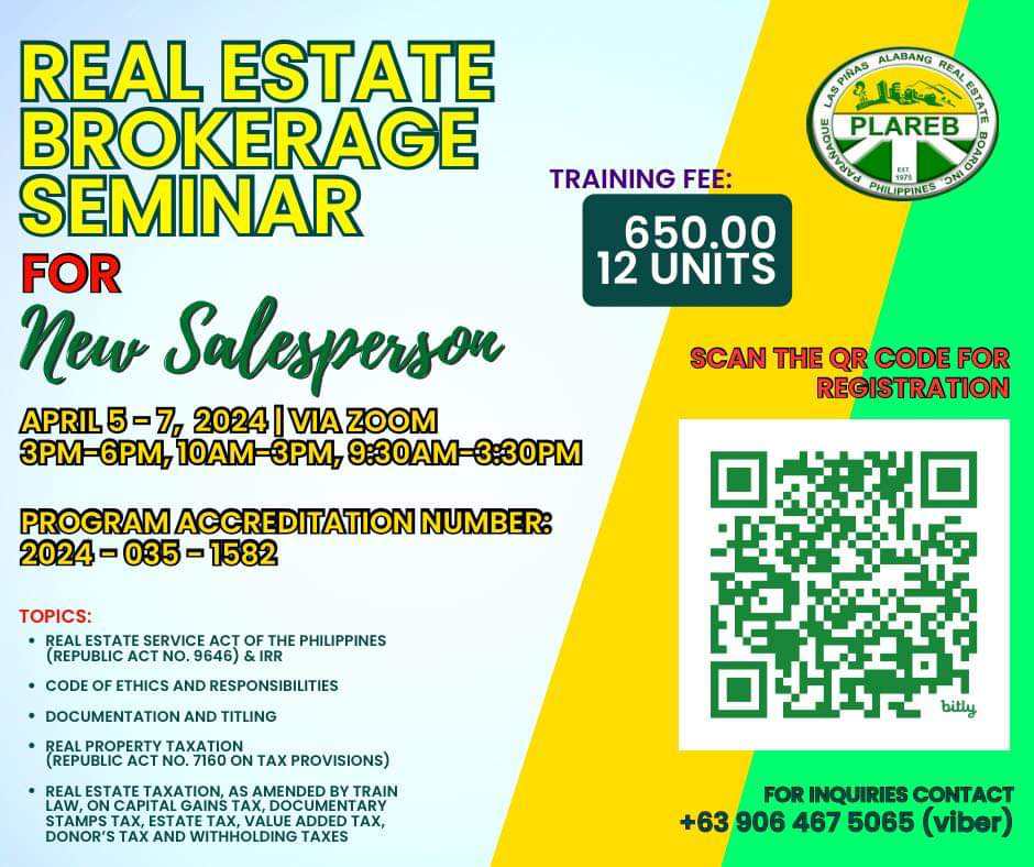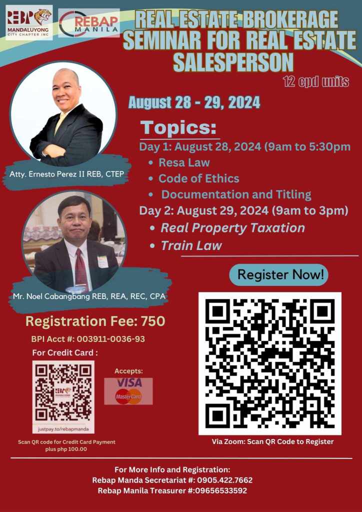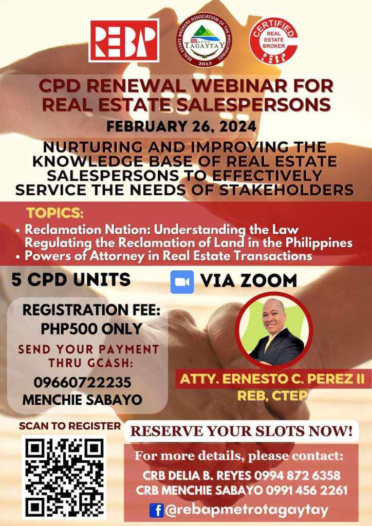 This is the Entry-level Seminar for aspiring Real Estate Salespersons who desire to be accredited under Rep. Act No. 9646, brought to you by REBAP Metro Tagaytay Chapter. I will present the following topics on October 5 & 7, 2023, respectively: (1) Standards of Practice Under RA 9646 [RESA]; (2) Code of Ethics and Responsibilities of RESPs; and (3) Documentation & Registration of Real Estate Transactions. To register for this Webinar, kindly contact the Chapter Officers at their respective contact details, or via the Facebook page of REBAP Metro Tagaytay. Payment of the investment fee is via GCash – 09175640496, Lalaine G. Then scan the QR Code to register and upload your proof of payment. See you on the day of the Webinar.
