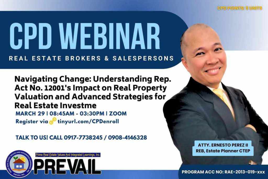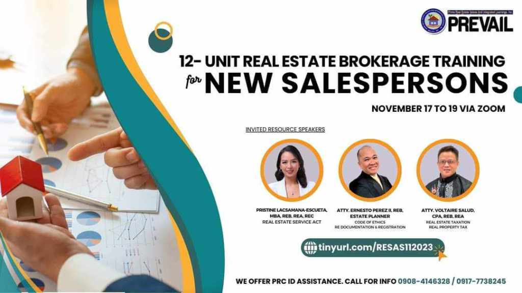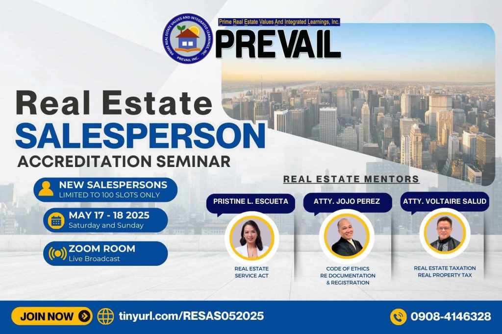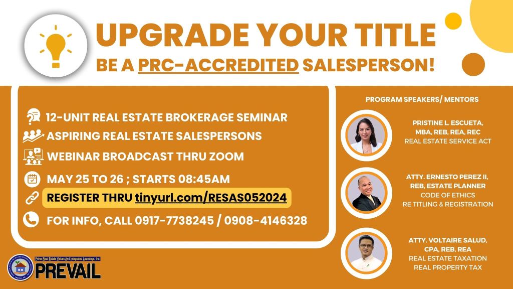 This training program is accredited by PRBRES to be taken by those desiring to be accredited real estate salespersons under Rep. Act No. 9646 and brought to you by Prime Real Estate Values and Integrated Learnings, Inc. (PREVAIL). I will present the following topics in the afternoon of May 17, 2025: (1) Code of Ethics and Responsibilities of RESPs; and (2) Documentation & Registration of Real Estate Transactions. For further registration details, kindly visit the Facebook Page of PREVAIL. Or type “tinyurl.com/RESAS052025” in your browser and register immediately. See you in the Zoom room.