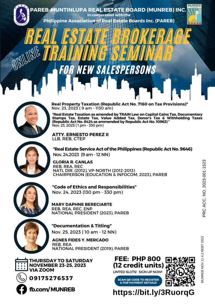 The PAREB-Muntinlupa Real Estate Board (MUNREB) in cooperation with PAREB will be holding its first online Real Estate Brokerage Training Seminar for aspiring Real Estate Salespersons who desire to be accredited under Rep. Act No. 9646. I will present the following topics on November 23, 2023, respectively: (1) Real Estate Taxation as amended by TRAIN Law; and (2) Real Property Taxation (RA 7160 on Tax Provisions. To register and get payment details scan the QR Code or contact MUNREB on its Facebook Page or the contact number on the banner. For inquiries email: munreb.education@gmail.com.