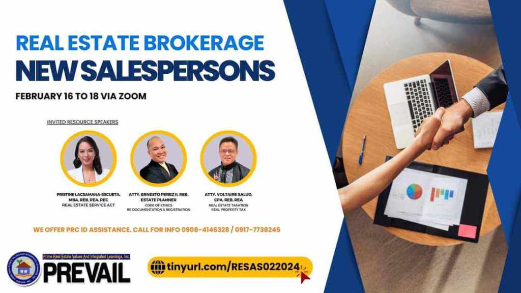 This training program is accredited by PRBRES to be taken by those desiring to be accredited real estate salespersons under Rep. Act No. 9646 and brought to you by Prime Real Estate Values and Integrated Learnings, Inc. (PREVAIL). I will present the following topics in the afternoon of February 18, 2025: (1) Code of Ethics and Responsibilities of RESPs; and (2) Documentation & Registration of Real Estate Transactions. For further registration details kindly visit the Facebook Page of PREVAIL. Or type “tinyurl.com/RESASFeb2025” in your browser and register immediately. See you in the Zoom room.