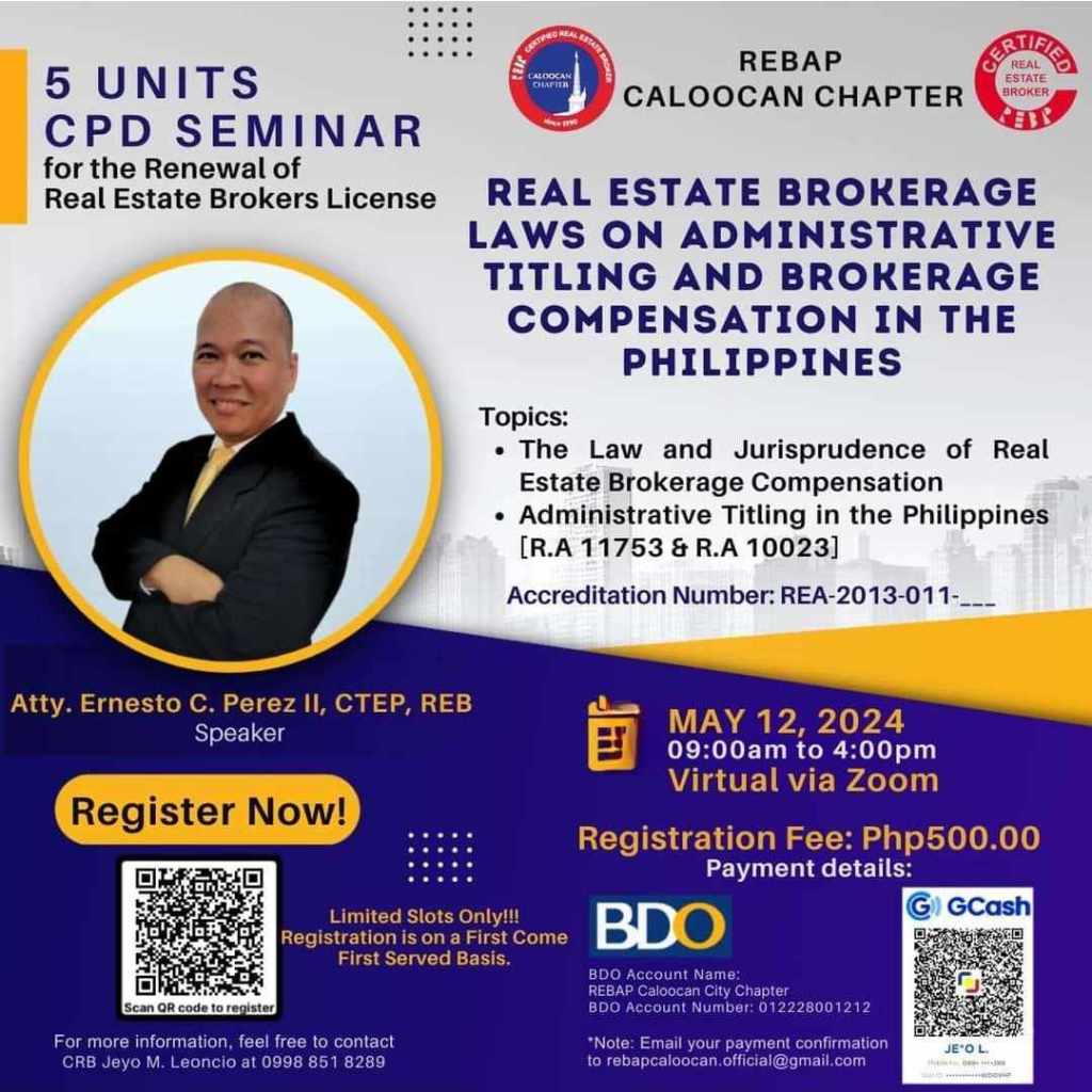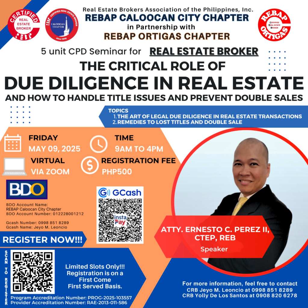 This CPD event is specifically for Real Estate Brokers who must renew their accreditation for the second and third quarters of 2025. This CPD Event is brought to you by REBAP Caloocan Chapter. I will present the following topics on May 9, 2025: (1) The Art of Due Diligence in Real Estate Transactions – morning session; and (2) Remedies to Lost Titles and Double Sales – afternoon session. Scan the QR Code to register. See you in the Zoom room.