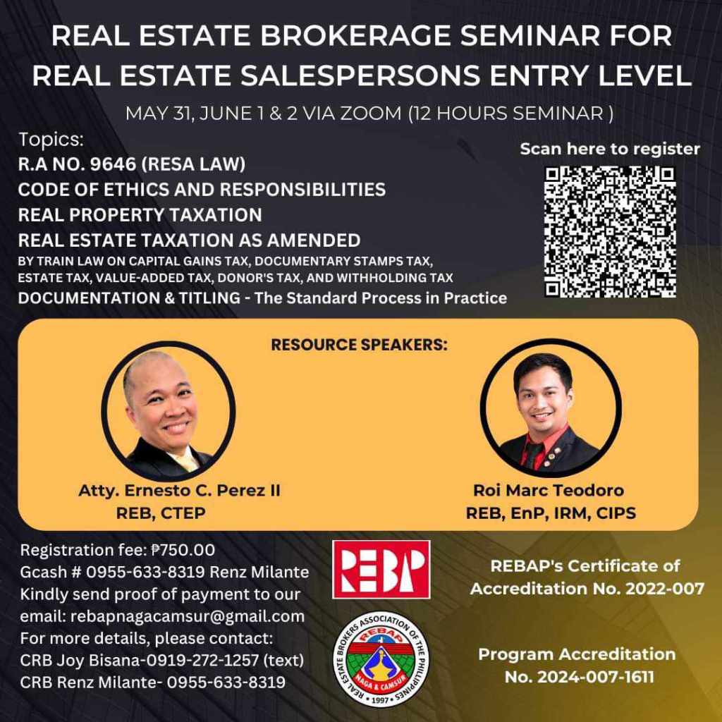 This is the Entry-level Seminar for aspiring Real Estate Salespersons who desire to be accredited under Rep. Act No. 9646, brought to you by REBAP Mandaluyong Chapter. I will present the following topics on June 10 & 12, 2023, respectively: (1) Standards of Practice Under RA 9646 [RESA]; (2) Code of Ethics and Responsibilities of RESPs; and (3) Documentation & Registration of Real Estate Transactions. Scan the QR Code or contact the CRBs at their contact numbers on the banner.