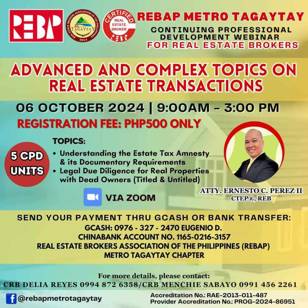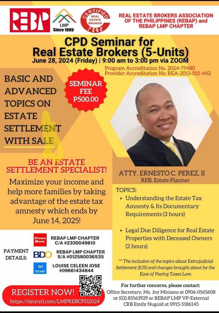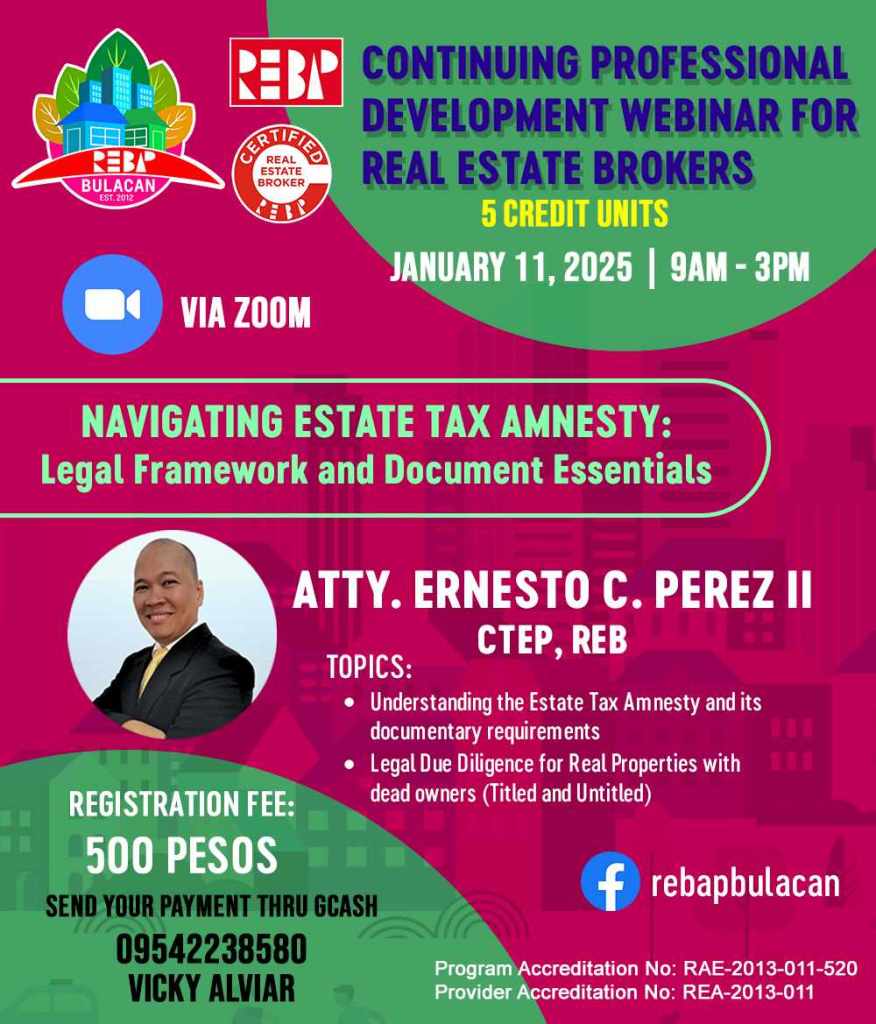 This CPD event is specifically for Real Estate Brokers who must renew their professional identification card (PIC) in the first quarter of 2025. This 5-hour CPD seminar is brought to you by REBAP Bulacan Chapter. I will present the following topics: (1) Understanding the Estate Tax Amnesty & Its Documentary Requirements and (2) Legal Due Diligence for Real Estate Properties with Deceased Owners. Payment of the learning fee is via GCash – 09542238580. For further questions on the registration process, kindly contact the Facebook account of REBAP Bulacan Chapter. See you in the Zoom room.