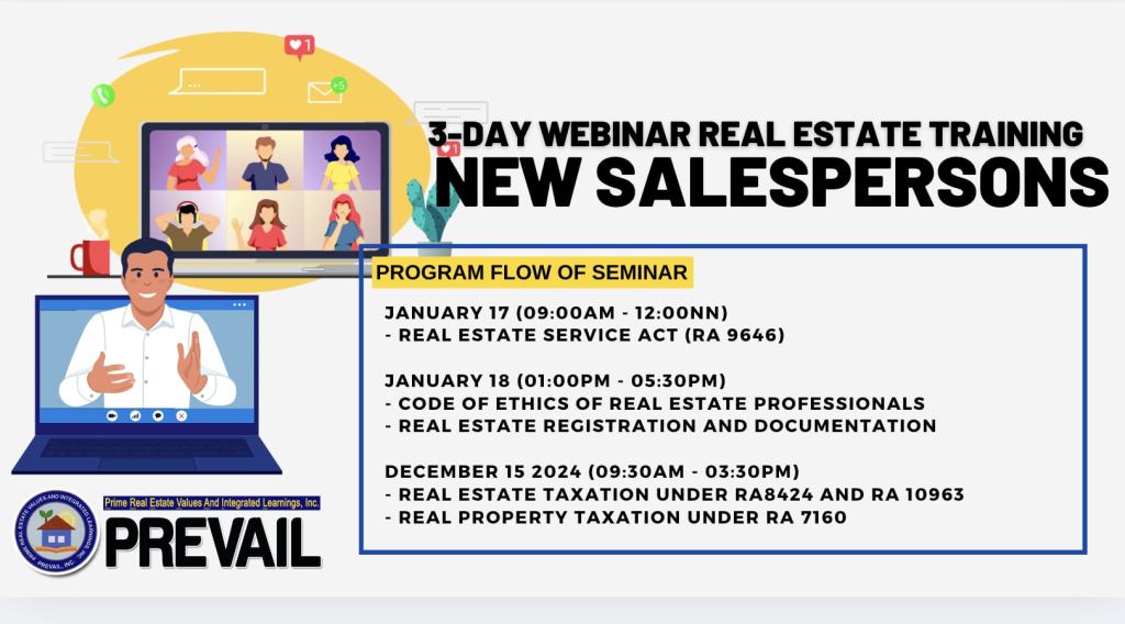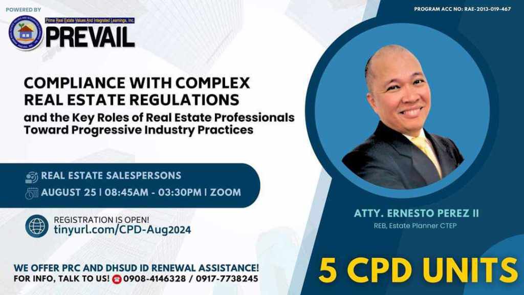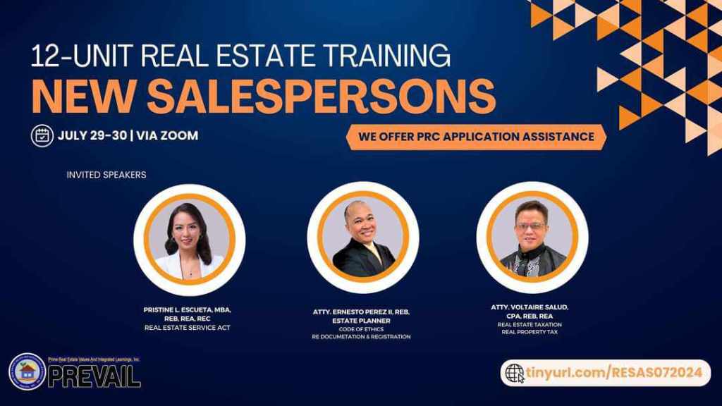 This training program is accredited by PRBRES to be taken by those desiring to be accredited real estate salespersons under Rep. Act No. 9646 and brought to you by Prime Real Estate Values and Integrated Learnings, Inc. (PREVAIL). I will present the following topics in the afternoon of June 25, 2025: (1) Code of Ethics and Responsibilities of RESPs; and (2) Documentation & Registration of Real Estate Transactions. For further registration details, kindly visit the Facebook Page of PREVAIL. Or type “tinyurl.com/RESalespersons” in your browser and register immediately. See you in the Zoom room.
