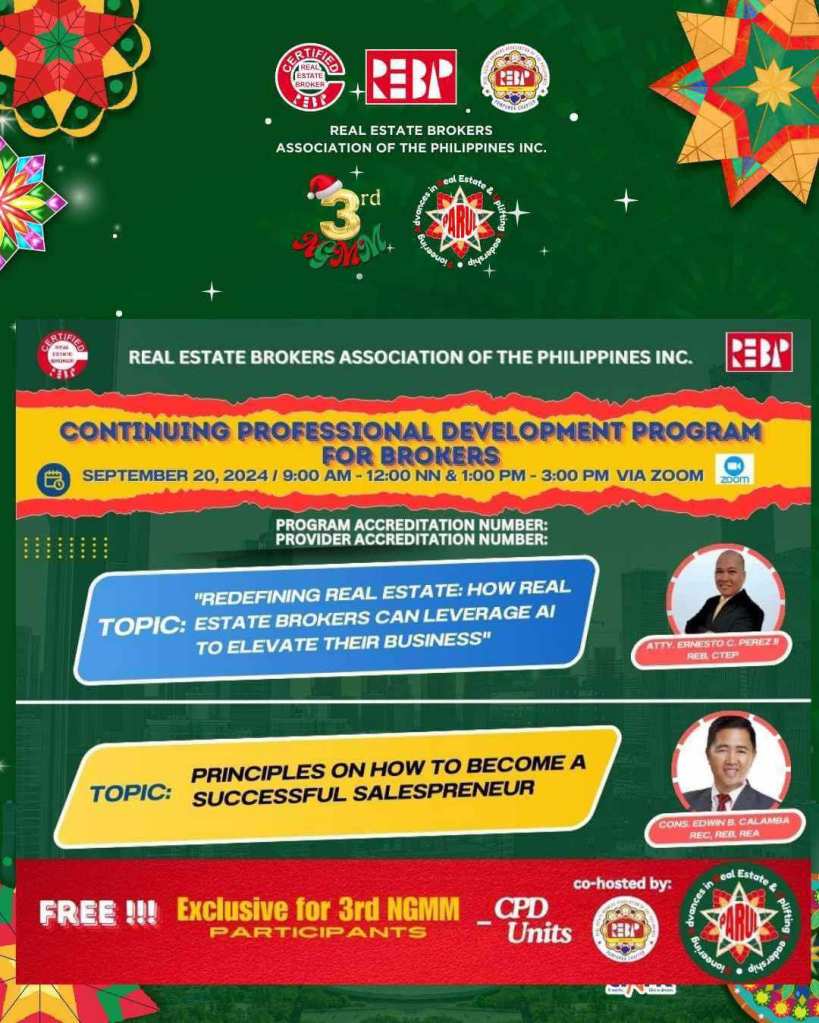 This CPD event is specifically for CRBs who attended the REBAP National Convention last November 8-10, 2024 in Tagaytay City. This CPD Event is brought to you by the Real Estate Brokers Association of the Philippines (REBAP). I be the first speaker of this CPD Seminar series, and I will present the following topics: (1) Global Real Estate Trends & Their Impact on the Philippine Market – morning session; and (2) Ethical Leadership and Professionalism in a Globalized Real Estate Market – afternoon session. See you in the Zoom room.