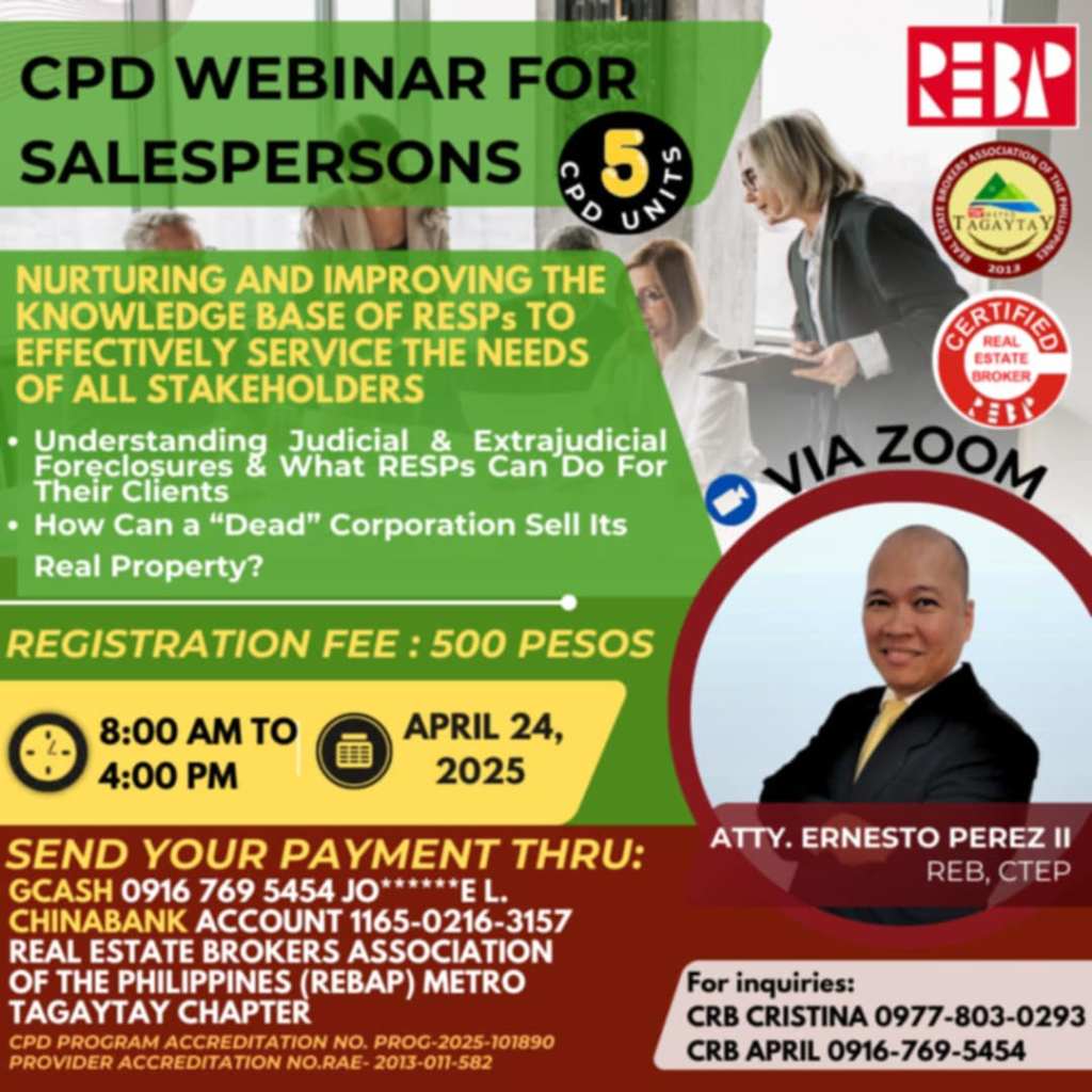 This CPD event is specifically for Real Estate Salespersons, who must renew their accreditation in the second quarter of 2025. This 5-hour CPD seminar is brought to you by REBAP Metro Tagaytay Chapter, my beloved Chapter. I will present the following topics: (1) Understanding Judicial and Extrajudicial Foreclosures and What RESPs Can Do For Their Clients, and (2) How Can a “Dead” Corporation Sell Its Real Estate. Payment of the learning fee is via GCash – 09167695454. For further questions on the registration process, kindly contact the numbers on the banner. See you in the Zoom room.
