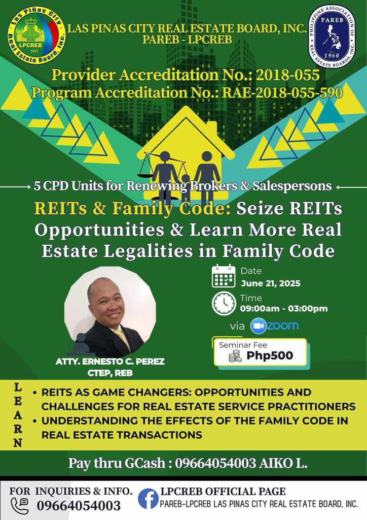 This CPD event is specifically for Real Estate Brokers and Salespersons who must renew their professional identification card (PIC) in the third quarter of 2025. This 5-hour CPD seminar is brought to you by PAREB-LPCREB. I will present the following topics: (1) REITs as Game Changers: Opportunities and Challenges for Real Estate Service Practitioners and (2) Understanding the Effects of the Family Code in Real Estate Transactions. Payment of the learning fee is PhP 500.00 only. For further questions on the registration process, kindly contact 09664054003 or visit the LPCREB Official Facebook Page. See you in the Zoom room.