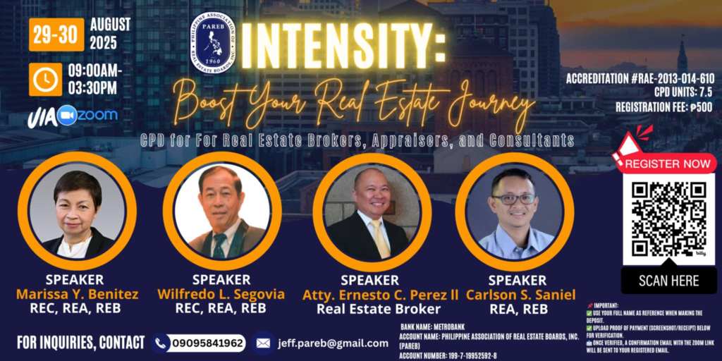 This CPD event is specifically for Real Estate Brokers, Appraisers, and Consultants who must renew their accreditation for the third and fourth quarters of 2025. This 7.5-credit unit CPD Event is brought to you by Philippine Association of Real Estate Boards, Inc. (PAREB). On the morning of August 30, 2025, I will present the topic Limitations on the Right to Ownership of Real Estate. For further registration details, kindly call 09095841962 or send an email to jeff.pareb@gmail.com. Or scan the QR Code on the banner. See you in the Zoom room.