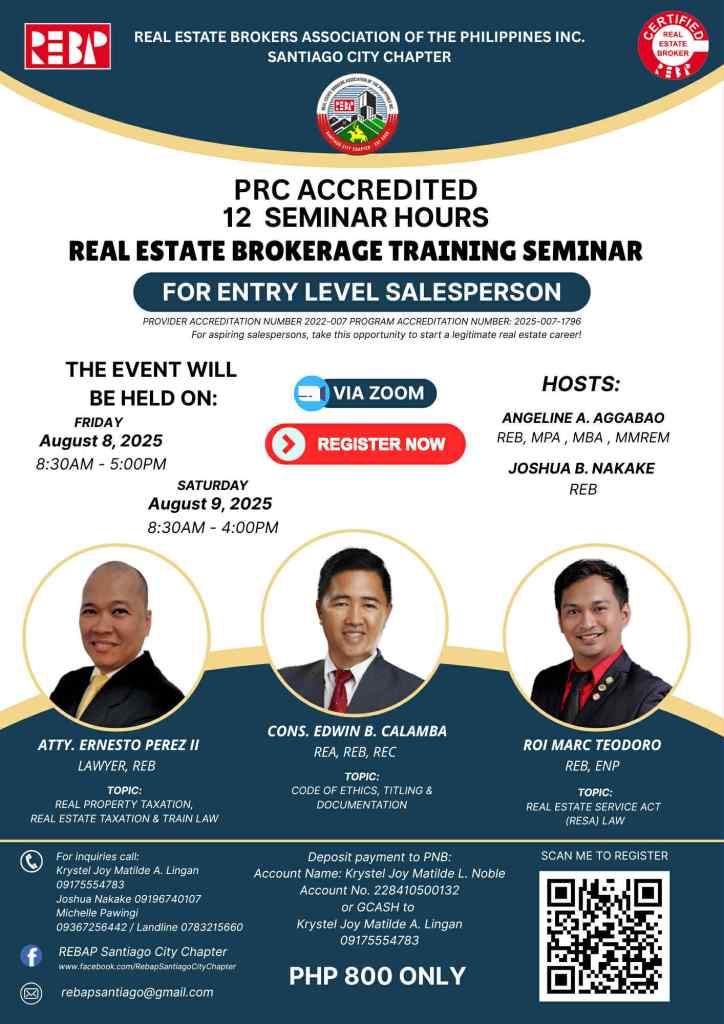 This training program is accredited by PRBRES to be taken by those desiring to be accredited real estate salespersons under Rep. Act No. 9646 and brought to you by REBAP Santiago City Chapter. I will present the following topics in the afternoon of August 9, 2025: (1) Real Estate Taxation Under the NIRC, as amended by the TRAIN Law; and (2) Real Property Taxation (RA 7160 on Tax Provisions). For further registration details, kindly call the numbers indicated at the bottom part of the banner. Or scan the QR Code on the banner. See you in the Zoom room.