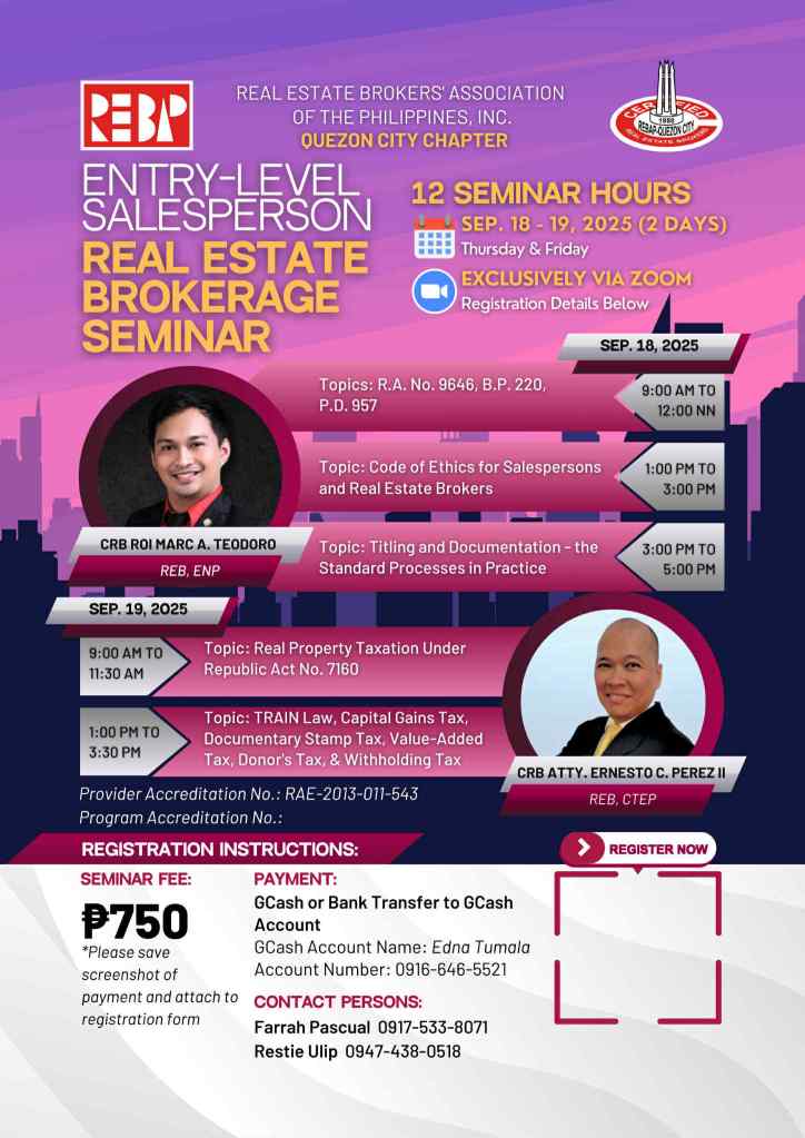 This training program is accredited by PRBRES to be taken by those desiring to be accredited real estate salespersons under Rep. Act No. 9646 and brought to you by REBAP Quezon City Chapter. I will present the following topics in the afternoon of September 19, 2025: (1) Real Estate Taxation Under the NIRC, as amended by the TRAIN Law; and (2) Real Property Taxation (RA 7160 on Tax Provisions). For further registration details, kindly call Farrah Pascual (09175338071) or Restie Ulip (09474380518). Or scan the QR Code on the banner. See you in the Zoom room.